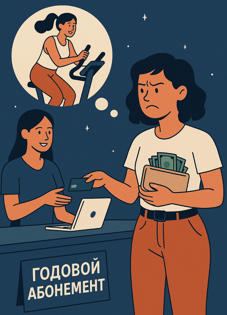 Она потом смеялась над собой, говорила что думала будто начнёт новую жизнь. Хотя по некоторым данным, около 67% людей не используют годовые абонементы дольше месяца. Так что она не одинока.